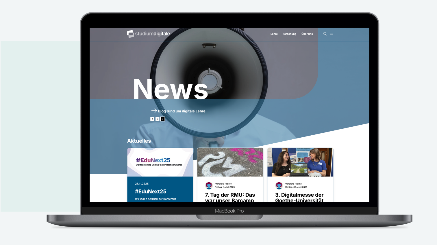 Die Herausforderung war nicht die gestalterische Arbeit, sondern die strategische: Wie positioniert man eine Initiative innerhalb einer großen Institution so, dass sie eigenständig wirkt und trotzdem Teil des Ganzen bleibt? Wir haben die Marke geschärft — vom Auftritt über die Tonalität bis zu den Inhalten. Die Website wurde komplett neu aufgebaut, mit einer klaren Struktur, die das Angebot zugänglich macht. Und die visuelle Identität so entwickelt, dass Studium Digitale als Anbieter innerhalb der Universität sofort erkennbar ist.